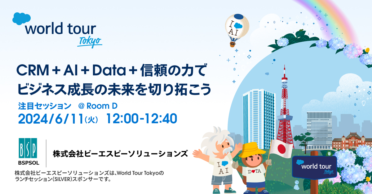 株式会社ビーエスピーソリューションズは、2024年6月11日(火)~12日(水)に開催される株式会社セールスフォース・ジャパン主催の「Salesforce World Tour tokyo」にスポンサーとして協賛し、NECネッツエスアイ株式会社 DXソリューション事業本部 業務改革DX本部長 山本芳史氏をゲストスピーカーに迎え、「機器の構成管理で循環型ビジネス推進!NESIC社取り組みに迫る」というタイトルで6月11日(火)12:00~12:40にランチセッションを実施します。